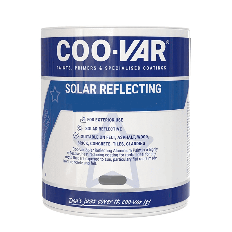 Coo-Var Solar Reflecting Roof Paint is a bright water based coating in white & a high reflective metallic silver aluminium finish, used to protect, reflect & reduce heat build up & UV on